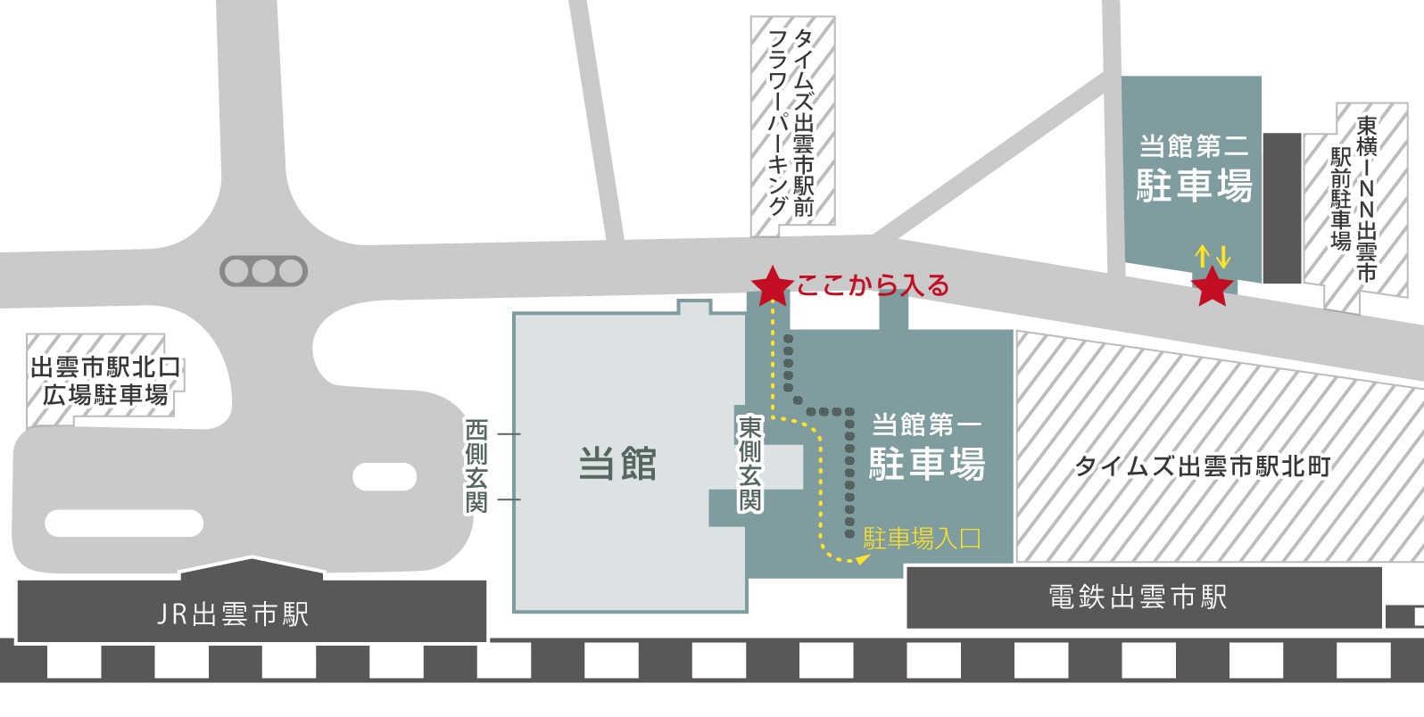 ■第二駐車場を出て横断歩道で道をわたり右に徒歩1分進んでいただくと当館正面玄関がございます。